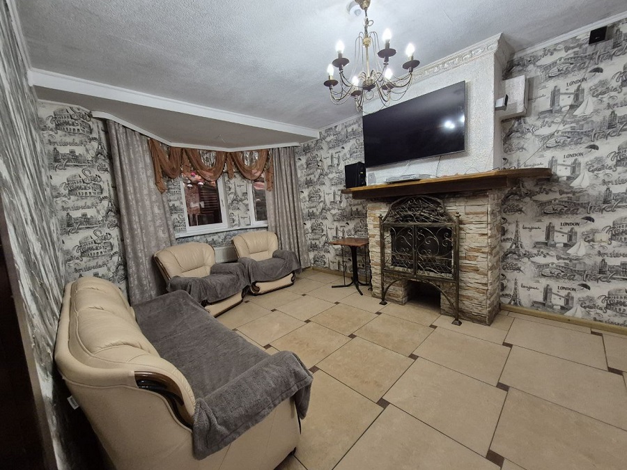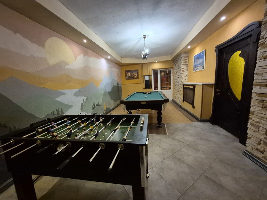 К вашим услугам: большой каминный зал с танцполом, большой банкетный зал на 50 человек, музыкальное оборудование, караоке. Крытая беседка с мангалом. Для активного отдыха теннисный стол, бильярд пул (американка), дартс. Для размещения гостей предоставлены 5 отдельных комнат (до 24 спальных мест). Для любителей горячего пара сауна на дровах с бассейном и обливным ведром для желающих взбодриться.