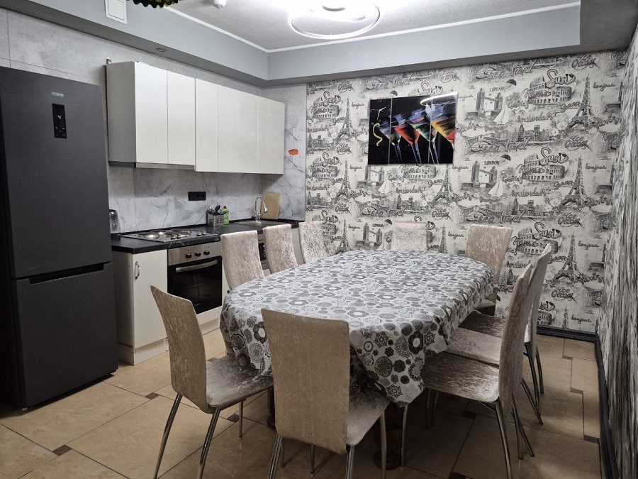 Благоустроенная кухня оснащена необходимыми бытовыми приборами позволит вам самим приготовить любое блюдо или разогреть привезенное с собой. Недалеко от коттеджа находится гипермаркет «Green» и «МоМо».